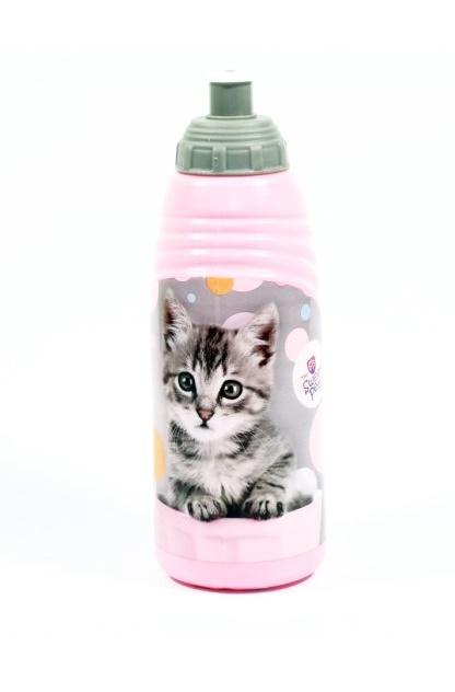 Bidon plastikowy, okrągły. Nakrętka innego koloru niż cały bidon, zakończona sportowym "dziubkiem". Na butelce nadruk wielokolorowy.