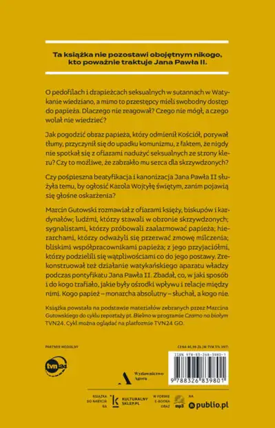 Informacje o pedofilach i drapieżcach seksualnych w sutannach spływały do Watykanu szerokim strumieniem, mimo to przestępcy mieli swobodny dostęp do papieża. Dlaczego Jan Paweł II nie reagował? Czego nie mógł, a czego wolał nie wiedzieć? Jak pogodzić obraz papieża, który odmienił oblicze Kościoła, porywał tłumy na całym świecie, przyczynił się do upadku komunizmu, z faktem, że nigdy nie pochylił się nad ofiarami nadużyć seksualnych ze strony kleru? Czy to możliwe, że zabrakło mu serca dla najbardziej skrzywdzonych przez przedstawicieli instytucji, którą kierował? Towarzyszący beatyfikacji i kanonizacji Jana Pawła II pośpiech sprawił, że zarzuty dotyczące tuszowania przestępstw na tle seksualnym w Kościele potraktowano nie dość poważnie. A może spieszono się, by ogłosić Karola Wojtyłę świętym, zanim pojawią się głośne oskarżenia? Te pytania nie pozostawiają obojętnym nikogo, kto poważnie traktuje Jana Pawła II. Marcin Gutowski przemierzył tysiące kilometrów, rozmawiał z ponad setką osób: ofiarami księży, biskupów i kardynałów; ludźmi, którzy mieli odwagę stawać w ich obronie; sygnalistami, którzy pisali i jeździli do Watykanu, by alarmować papieża; przedstawicielami kościelnego aparatu władzy, którzy odważyli się przerwać zmowę milczenia; bliskimi współpracownikami polskiego papieża; z jego wieloletnimi przyjaciółmi, którzy dziś, po raz pierwszy otwarcie, dzielą się wątpliwościami co do jego postawy, a nawet przyznają, że być może nigdy nie poznali prawdziwego oblicza Ojca Świętego. Autor zrekonstruował także sposób działania watykańskiego aparatu władzy podczas pontyfikatu Jana Pawła II. Zbadał, co, w jaki sposób i do kogo trafiało, jaki był system obiegu dokumentów, ośrodki wpływu i relacje między nimi. A wreszcie: kogo papież – monarcha absolutny – słuchał, a kogo nie. Marcin Gutowski – ur. w 1983 r. Absolwent Uniwersytetu Kardynała Stefana Wyszyńskiego w Warszawie. Dziennikarz, reportażysta oraz autor książek, m.in. „Święta ziemia. Opowieść z Izraela i Palestyny”, „Don Stanislao. Druga twarz kardynała Dziwisza”. W latach 2006-2007 współpracował z Programem III Polskiego Radia, gdzie prowadził autorskie audycje i był korespondentem zagranicznym na Bliskim Wschodzie, w Hiszpanii, Austrii, Wielkiej Brytanii, Włoszech, Norwegii. Relacjonował m.in. pielgrzymki papieża do Polski i Ziemi Świętej, wizytę Baracka Obamy w Izraelu. Publikował w czasopiśmie „Więź” i miesięczniku „W Drodze”. W 2012 r. był nominowany do nagrody dziennikarskiej MediaTory. Od 2017 r. jest reporterem magazynu „Czarno na białym” w TVN24.