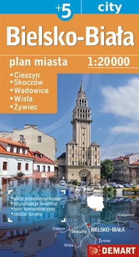 Plan Bielska-Białej w skali 1:20 000 plus centrum w skali 1:10 000, wzbogacony o plany najważniejszych miast w okolicy. - Ulice jednokierunkowe- Sygnalizacja świetlna- Linie komunikacyjne- Rzeźba terenu- Spisy ulic i informacje teleadresowe okolicznych miast- Szlaki turystyczne i ścieżki rowerowe.