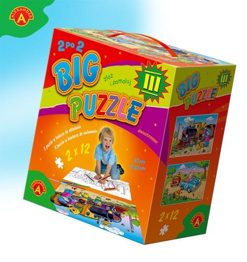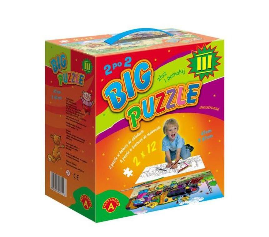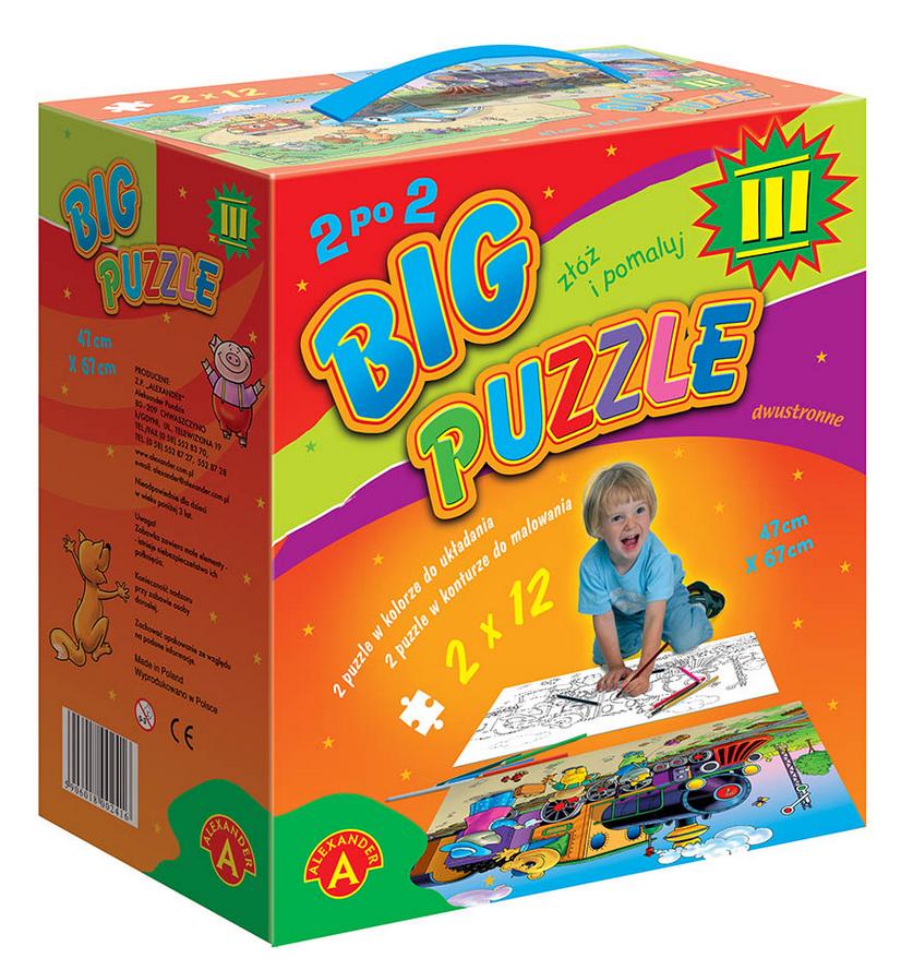 Opakowanie zawiera 2 układanki. Każda układanka jest dwustronna. Z jednej strony znajduje się kolorowy obrazek do układania, z drugiej strony znajduje się konturowy obrazek do układania i kolorowania. Układanki (puzzle) mają wymiar 47 x 67 cm i składają się z 12 elementów.