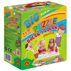Opakowanie zawiera dwie dwustronne układanki o wymiarach 47x67 cm. Po jednej stronie każdej układanki znajduje się kolorowy obrazek do złożenia . Po drugiej stronie znajduje się konturowy rysunek do złożenia i pokolorowania. Kolorowe puzzle są zarazem wzorem do kolorowania puzzli czarno-białych