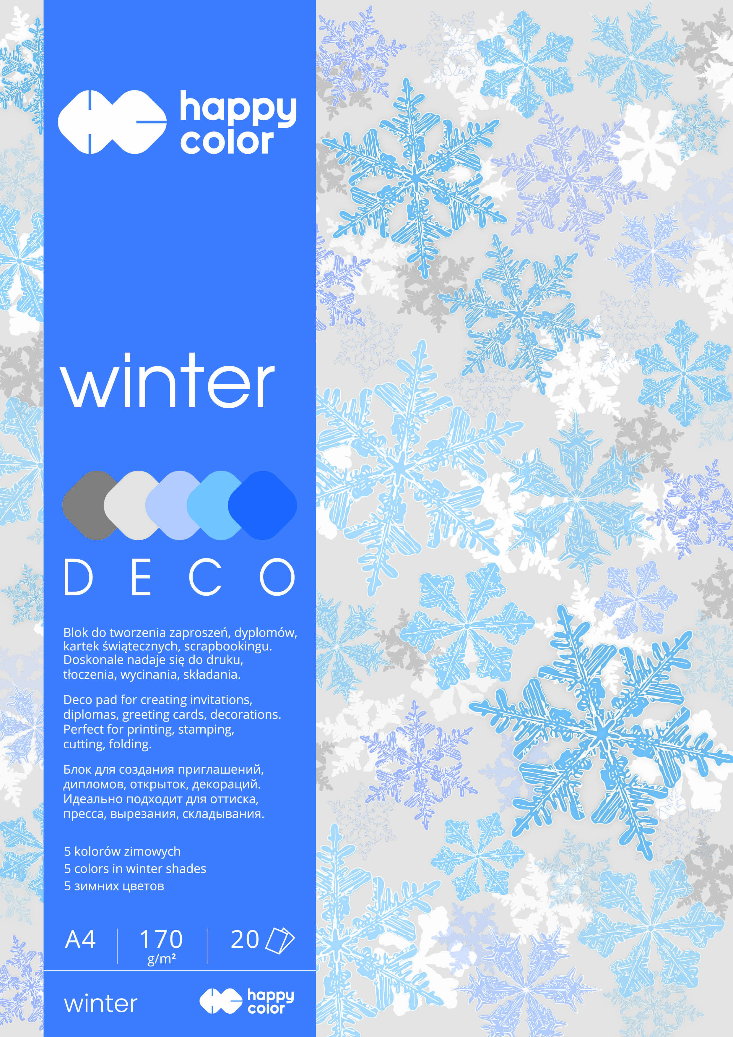 Blok papierów barwionych w masie w 5 odcieniach. Do tworzenia zaproszeń, dyplomów, kartek świątecznych, scrapbookigu itp. Doskonale nadale się do zadrukowywania, tłoczenia, wycinania, składania. Gramatura: 170g/m2. ilość arkuszy: 20.