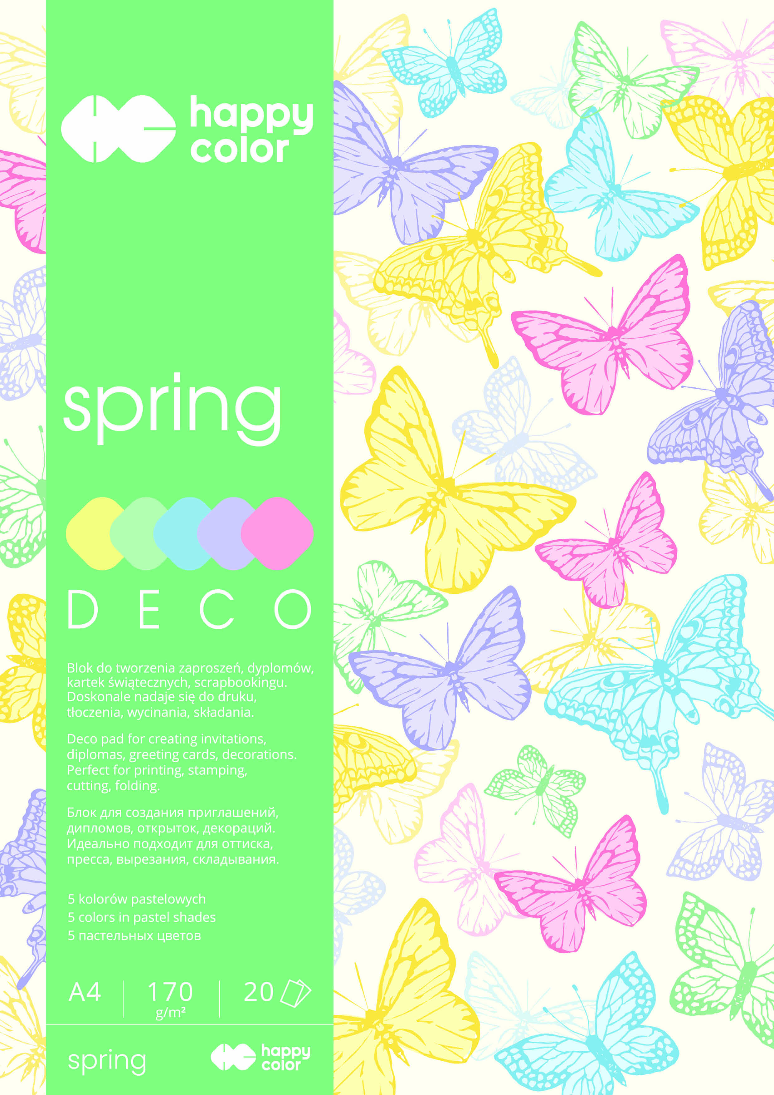 Blok papierów barwionych w masie w 5 wiosennych odcieniach. Do tworzenia zaproszeń, dyplomów, kartek świątecznych, scrapbookigu itp. Doskonale nadale się do zadrukowywania, tłoczenia, wycinania, składania. Gramatura: 170g/m2. ilość arkuszy: 20.