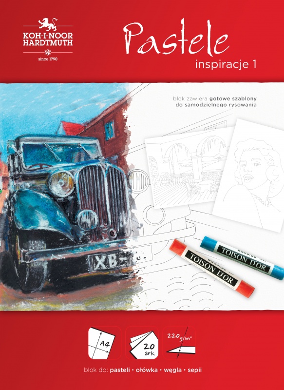 Blok szkicowy Koh-i-noor do pasteli, węgla, ołówka i sepii. Blok zawiera 20 arkuszy z nadrukiem o różnym stopniu trudności ( po 2 arkusze z wzoru). Do zestawu dołączona jest intrukcja wykonania..
