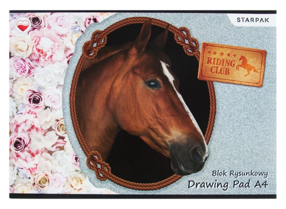 Blok rysunkowy z 20 białymi kartkami. Okładkę zdobią zdjęcia koni.