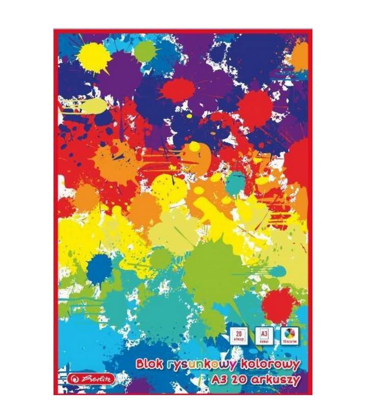 Blok rysunkowy kolorowy A3, papier barwiony w masie, 20 kolorowych arkuszy- 15 kolorów. Gramatura papieru 80g. 5 sztuk w opakowaniu zbiorczym.