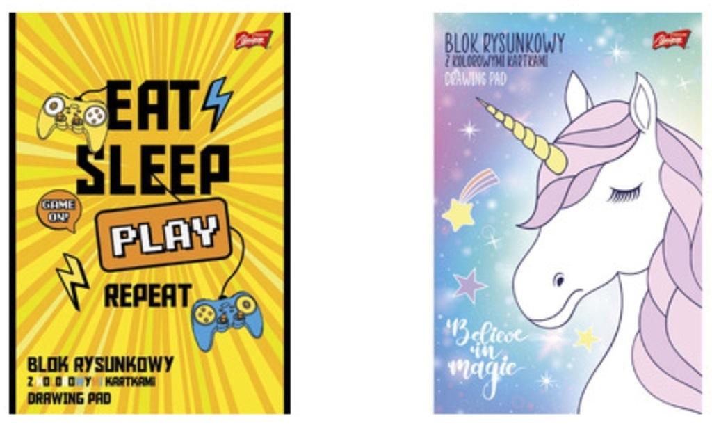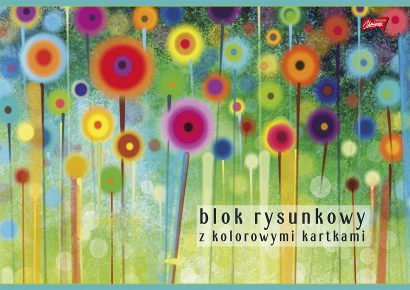 Blok zawiera 16 kolorowych kartek o gramaturze 80 g/m2. Kartki barwione w masie w kolorach żółty, różowy, pomarańczowy, czerwony, jasnozielony, ciemnozielony, jasnoniebieski, ciemnoniebieski. Okładka kredowa o gramaturze 115g/m2 wykorzystuje najnowsze motywy wzornicze UNIPAP. Dla podkreślenia, jakości wykończenia okładka jest dodatkowo nabłyszczana. Całość usztywniona tekturowym podkładem.