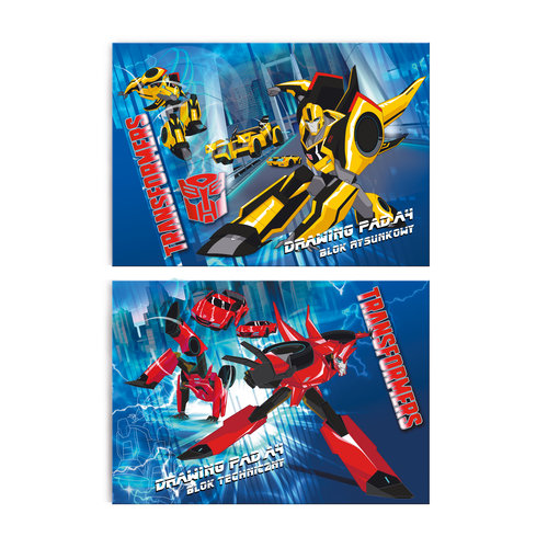 Blok techniczny z 10 białymi kartkami. Okładkę zdobią ulubione postacie Transformers.