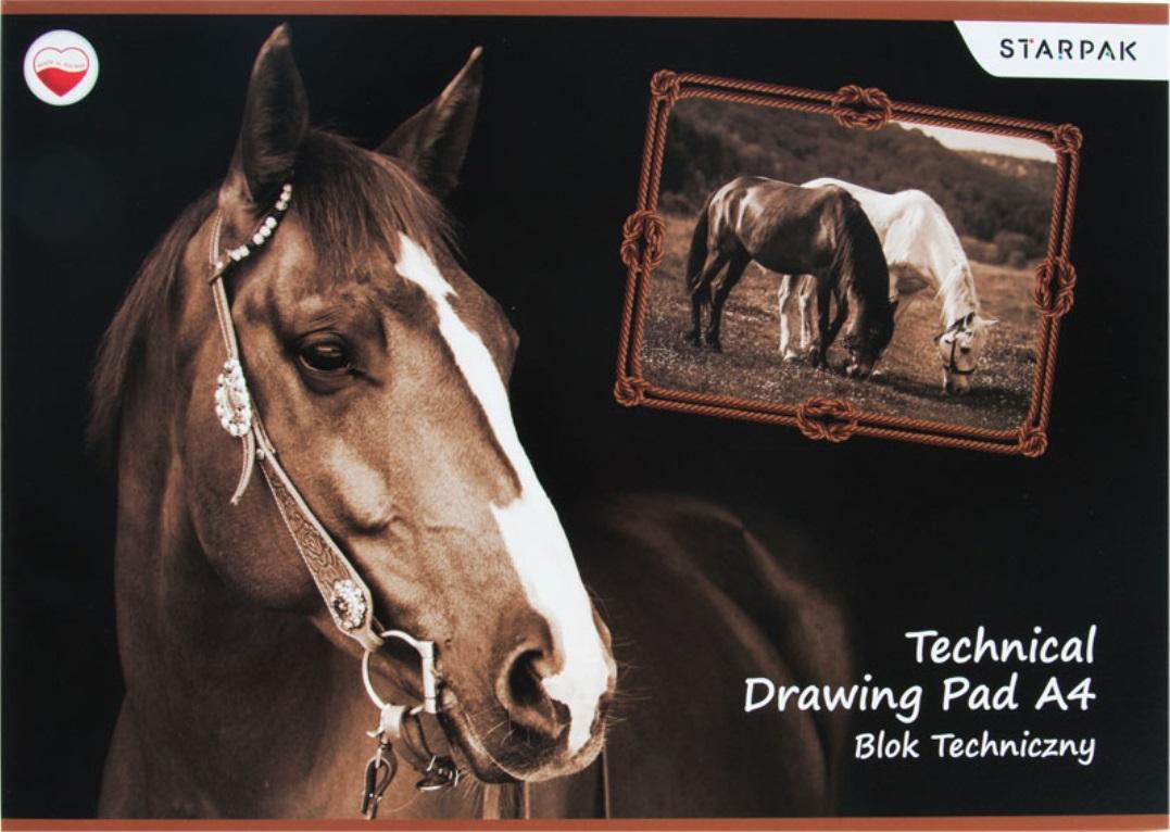 Blok techniczny z 10 białymi kartkami. Okładkę zdobią zdjęcia koni. 20 sztuk