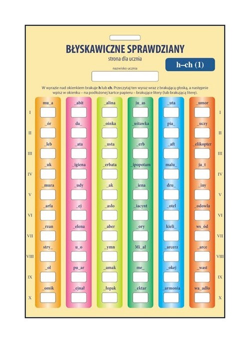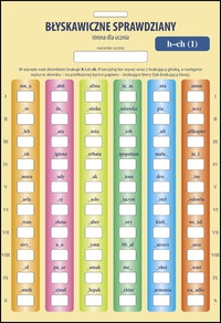 „Błyskawiczne sprawdziany” to pomoc dydaktyczna, dzięki której nauczyciel lub rodzic może ocenić, w jakim stopniu dziecko opanowało pisownię wyrazów z daną trudnością ortograficzną. Na karcie znajduje się lista 60 wyrazów, w których brakuje h lub ch. Poniżej wyrazów znajdują się wycięte pola, w których dziecko wpisuje – na podłożonej wcześniej kartce – brakujące litery. Następnie nauczyciel odwraca sprawdzian na drugą stronę i porównuje zapisy ucznia z prawidłowymi odpowiedziami. Błędy ortograficzne przekreśla czerwonym długopisem.
