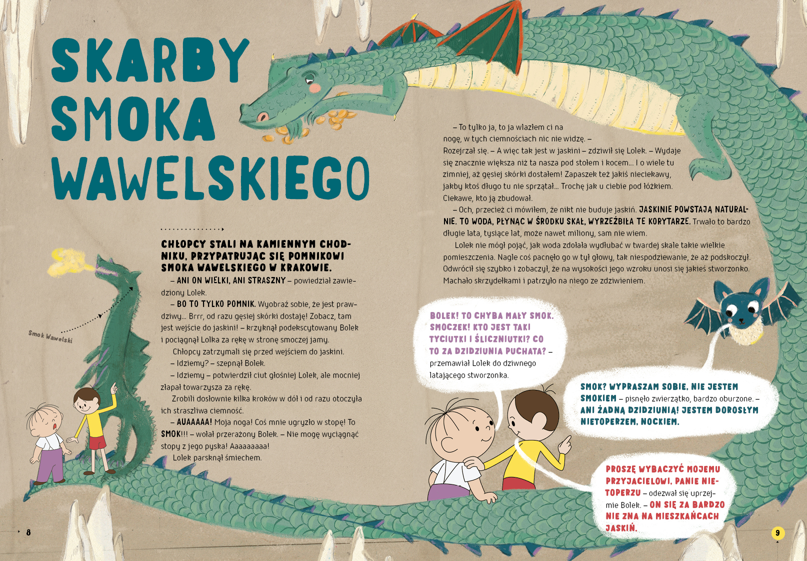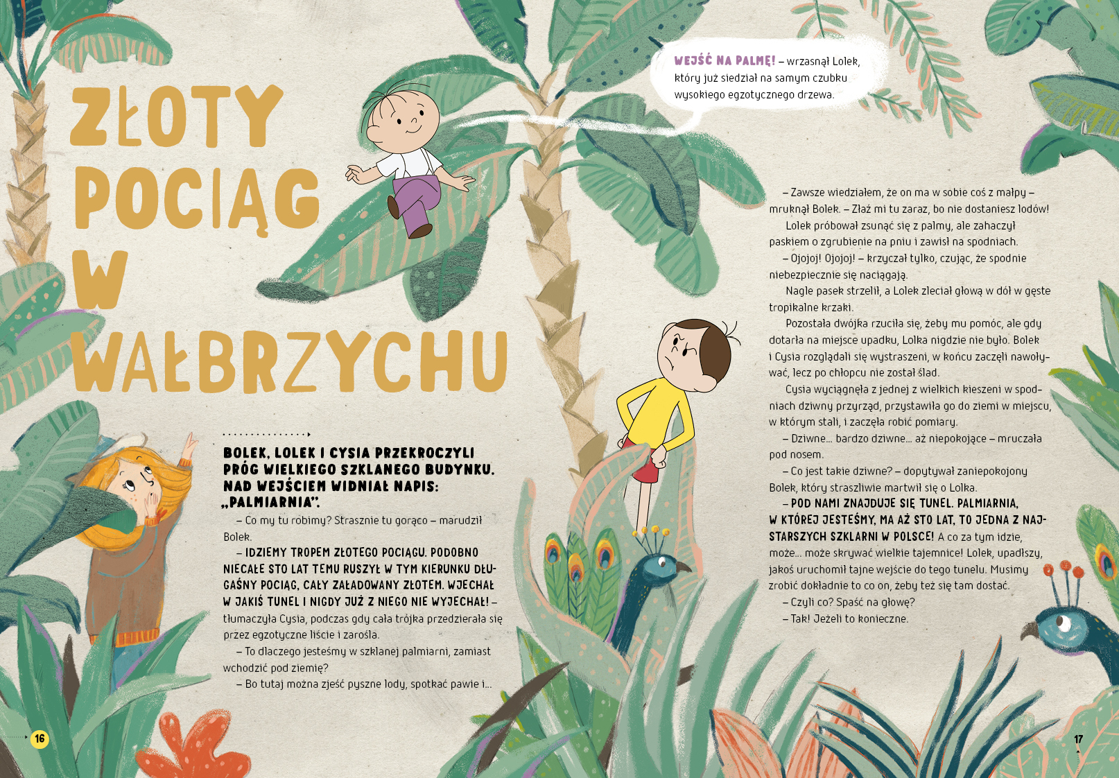 Nasi bohaterowie weszli w końcu do swojego wymarzonego skarbca i aż przymknęli oczy od blasku. Na wózku górniczym leżały piękne sztaby złota. Jedna na drugiej. Tylko czekały, aż ktoś je weźmie. Lolek ruszył pierwszy i w biegu już otwierał swój pusty do tej pory plecak. Bolek pędził tuż za nim, depcząc mu po piętach. Równocześnie dopadli wózek, złapali po jednej sztabce i.... - Są przyklejone - powiedział zaskoczony Bolek. - Nie da się ich podnieść. - Nie są przyklejone, tylko są bardzo, bardzo ciężkie - zaśmiała się Cysia. - Jedna taka sztabka ważny dwadzieścia kilogramów... - Czyli dwie sztabki ważą tyle co ja - powiedział zszokowany Lolek. - Nie uniosę jej, stwierdził ze smutkiem i zaczął zamykać plecak. - Hej, nie martwcie się! Chcieliśmy znaleźć skarbiec i go znaleźliśmy, chcieliśmy mieć przygody i je mamy! A to jeszcze nie jest koniec naszej wyprawy! Nagle zza wózka wystawił główkę dziwny zielony stworek, którego poznali już jako gnoma. Popatrzył w oczy smutnych i zawiedzionych chłopców, powiedział coś po gnomowemu i wyciągnął na dłoni malutkie grudki złota. Bo nawet gnomy nie lubią, kiedy ktoś jest smutny, i zaraz chcą poprawić każdemu humor. /fragment książki/