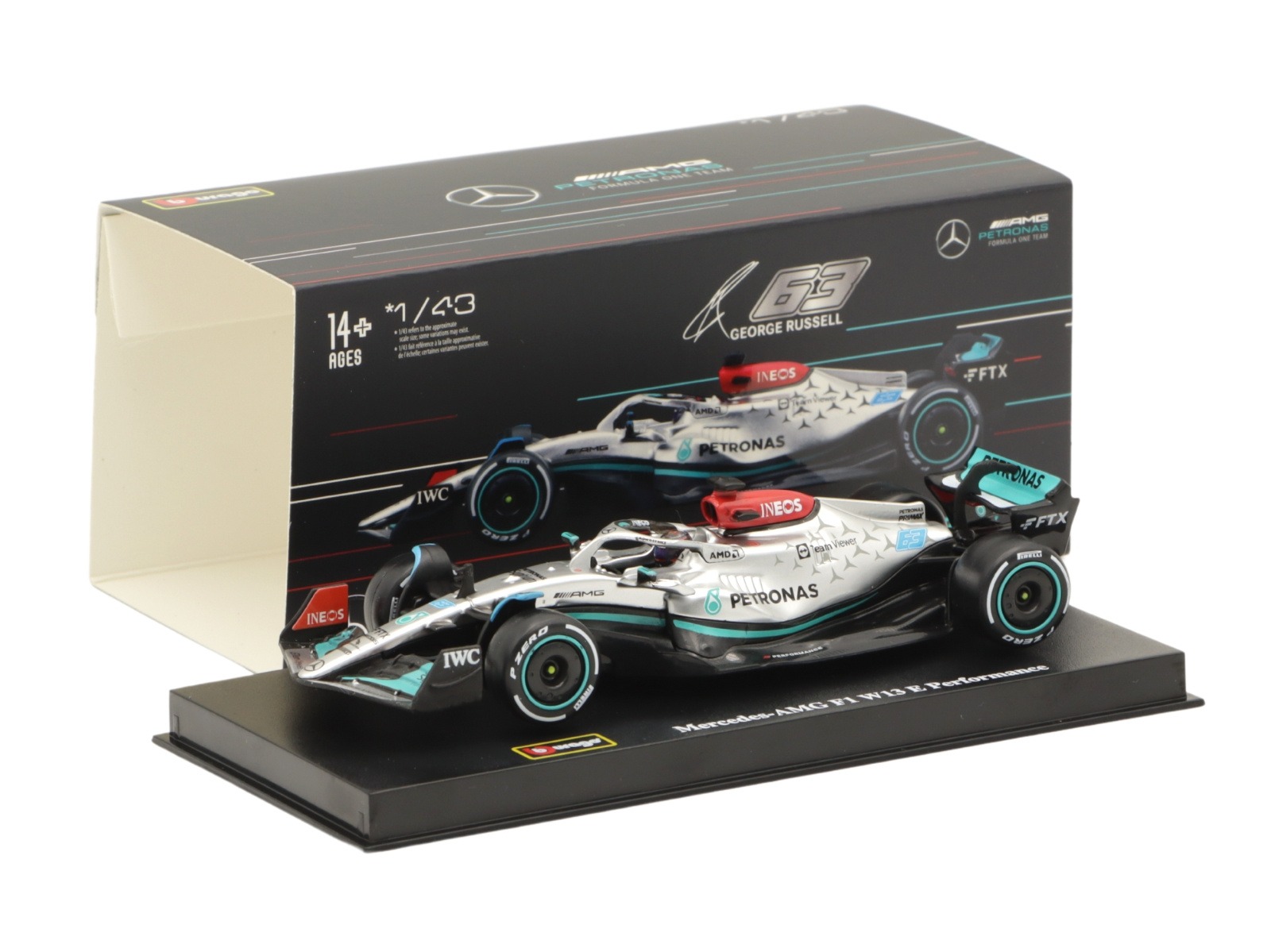 Bolid Formuły MERCEDES AMG W13 E Performance (model firmy Bburago nr kat.: 38066 ) nr startowy 63 - George Russell, sezon 20222
