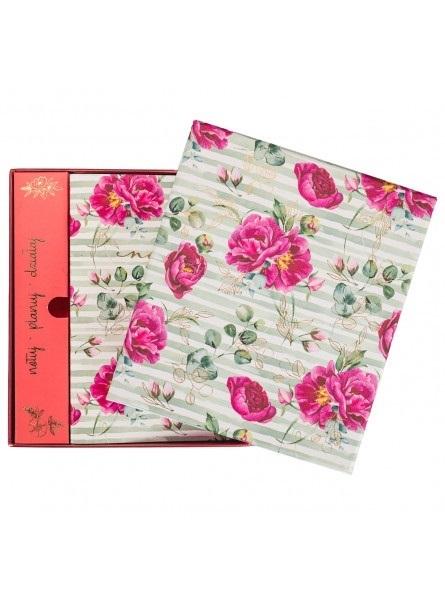 Zestaw prezentowy Lato zawiera pudełko upominkowe z wieczkiem ozdobionym motywem kwiatowym z subtelnymi złoceniami oraz idealnie dobranym kolorem metalizowane spody. Wewnątrz pudełka umieściliśmy pięć różnych, starannie dobranych romantycznych notatników. Kwiatowe okładki zdobione tłoczeniami złotą folią, tworzą piękną kompozycję graficzną, a kolorowe przeszycia grzbietów dopełniają wyjątkowy charakter i podkreślają znaczenie detali. Notatniki sprawdzą się jako pamiętnik, szkicownik lub miejsce na wszelkie codzienne notatki.