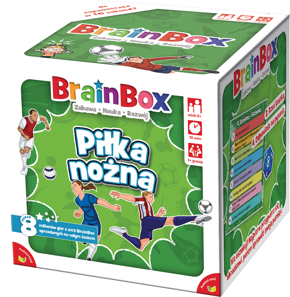 BrainBox - Piłka nożna to nie lada wyzwanie dla wszystkich fanów futbolu. Na 55 kartach znajdziesz 440 pytań dotyczących słynnych klubów piłkarskich i najpopularniejszych piłkarzy z całego świata. Za pomocą wspaniałych ilustracji i zabawnych ciekawostek, gra przybliża sylwetki najznamienitszych zawodników z najwyższych europejskich lig, drużyn z Ameryki Południowej, a nawet dalszych zakątków globu.