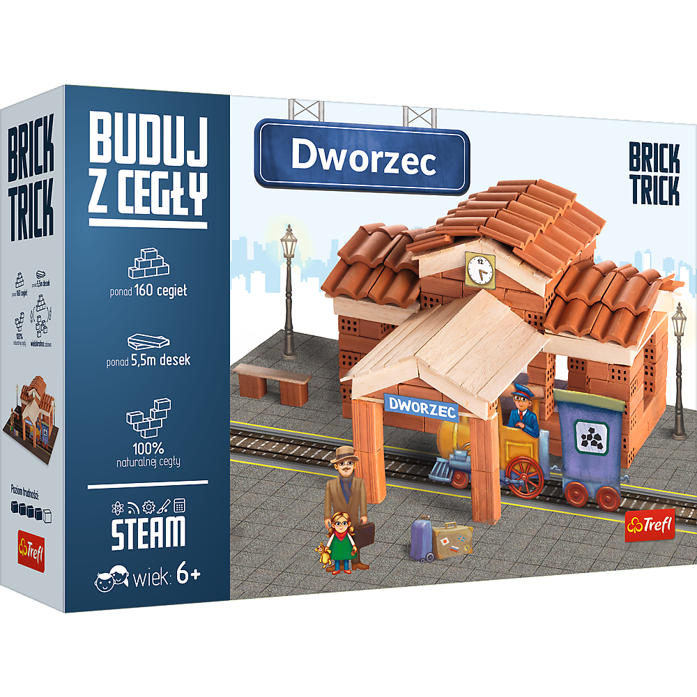 Wybuduj dworzec kolejowy, wykorzystując prawdziwe cegły i drewno. Skorzystaj z dołączonych planów budowy lub użyj wyobraźni do stworzenia niepowtarzalnej konstrukcji. Baw się dołączonymi pionkami prosto z miejskiego świata! To nie koniec zabawy! Rozpuść konstrukcję w wodzie i buduj dalej wykorzystując ponownie te same cegły! W zestawie znajdziesz: prawdziwe cegły, klej, drewniane deseczki, pionki, podstawkę, naklejkę i instrukcję!