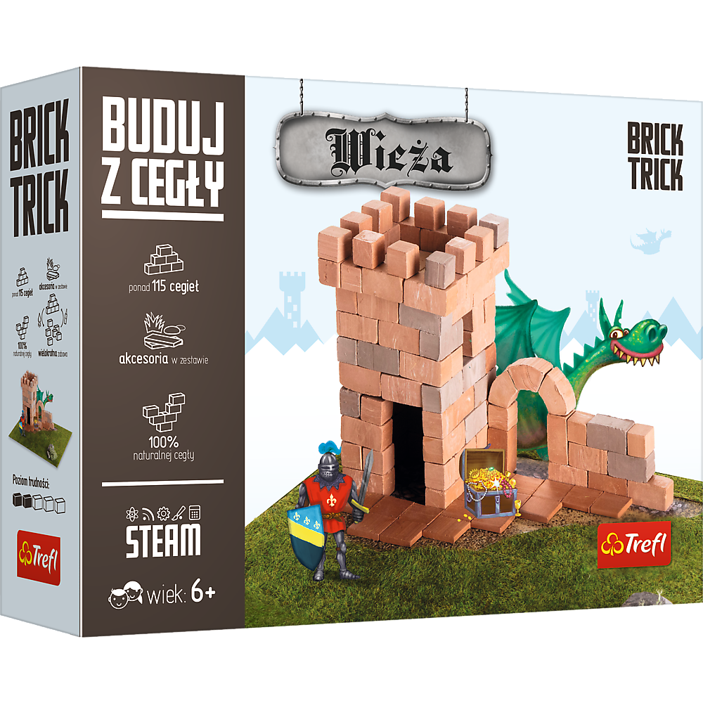 Brick Trick - Zabawa Murowana! Zostań konstruktorem, wykorzystując do budowy prawdziwe cegły i drewno! W instrukcji znajdziesz obszerne ciekawostki prosto z placu budowy. Dowiedz się, jak urozmaicić swoją konstrukcję dzięki wielu interesującym pomysłom i rozwiązaniom. Buduj według instrukcji lub użyj wyobraźni do stworzenia własnej, niepowarzalnej konstrukcji. Możesz też połączyć kilka budynków, tworząc klimat wsi, miasta lub średniowiecza.