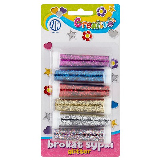 Przeznaczony jest do dekoracji prac plastycznych, ozdób świątecznych, papieru, scrapbookingu. Można nim również dekorować przedmioty wykonane z gliny, masy solnej itp. Pojemniki posiadają otwory ułatwiające dozowanie brokatu, mix 6 kolorów.