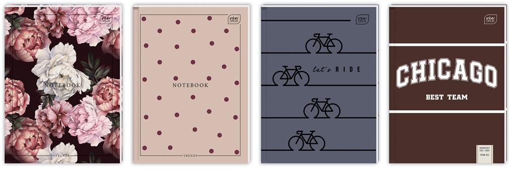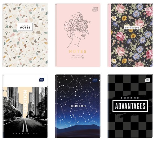 Brulion A4 w kratkę, 96 kartek, mix wzorów. 5 sztuk w opakowaniu zbiorczym. Producent Interdruk.