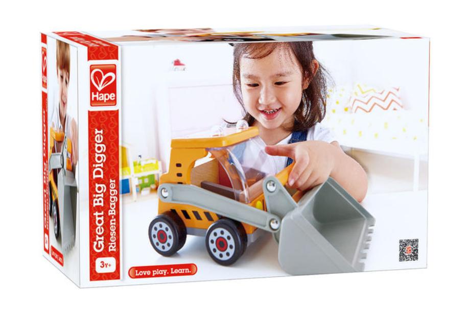 Pojazd budowlany z ruchomą łyżką, na którą można nabrać prawie wszystko. Wygodny uchwyt pomaga sterować łyżką maszyny. Auto wykonane jest z drewna z elementami plastiku. Jest solidne, doskonałe na długie godziny zabawy. Spycharka sprawi wiele radości małemu wielbicielowi maszyn budowlanych.