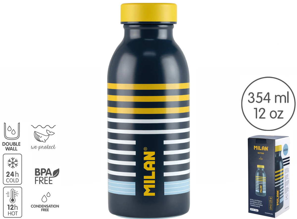 Butelka izotermiczna ze stali nierdzewnej. Specjalna seria Swims, granatowa. Pojemność: 354 ml. Butelka izotermiczna ze stali nierdzewnej z podwójną warstwą. Izolacja próżniowa: zapobiega kondensacji i utrzymuje zewnętrzną powierzchnię w temperaturze pokojowej. Utrzymuje temperaturę płynu w środku do 12 godzin przy gorących napojach i do 24 godzin przy zimnych napojach. Hermetyczna zakrętka z uszczelką z polipropylenu. Antypoślizgowa podstawa silikonowa.