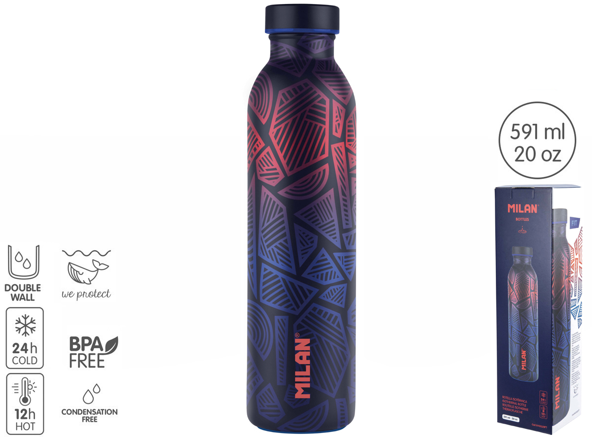 Butelka termiczna z kolekcji FIT. Duża w kolorze niebieskim z czerownym i niebieskim nadrukiem. Wykonana ze stali nierdzewnej. Posiada hermetyczną zakrętkę z uszczelką polipropylenową dla maksymalnej szczelności. Dwuwarstwowa izolacja próżniowa pozwala utrzymać temperaturę wewnątrz do 12 godzin dla płynów gorących i 24 godziny dla płynów zimnych. Zapobiega także kondensacji na zewnętrznej powierzchni, dzięki czemu butelka nie „poci” się w dłoni lub torbie i zawsze pozostaje w temperaturze pokojowej. Może służyć jako termos na gorące napoje. BPA free: zachowuje smak i świeżość wody. Antypoślizgowa podstawa silikonowa. Przed pierwszym użyciem wypłucz w czystej wodzie 3 razy. Po każdym użyciu umyj ręcznie i wypłucz. Przechowuj otwartą. Nie zalewaj wrzątkiem. Nie wlewaj: alkoholu, tłuszczu, produktów mlecznych, napojów gazowanych. Nie myj w zmywarce, nie zamrażaj, ani nie używaj w kuchence mikrofalowej. Pamiętaj!!! Stosowanie butelek wielokrotnego użytku przyczynia się do zmniejszenia zużycia plastikowych butelek jednorazowego użytku. Pojemność: 591 ml. Wysokość 26,2 cm. Średnica: 6,85 cm. Waga: 0,27 kg.