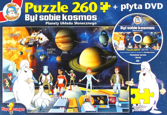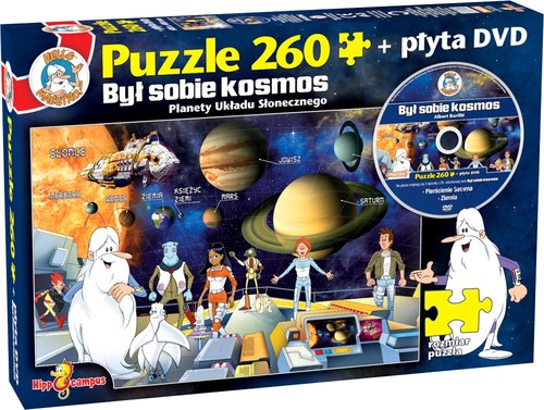 Puzzle 260 elementów + płyta DVD. Na podsatwie filmu Alberta Barille, projekt postaci Jean Barbaud. Puzzle - Planety Układu Słonecznego: słońce i planety wielkości w skali, odległości nie zachowują skali. Rozmiar obrazka po ułożeniu 600 x 400mm. Płyta DVD- 2 epizody z 26 odcinkowej serii Był sobie Kosmos- Pierścienie Saturna, Ziemia.