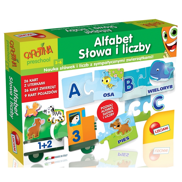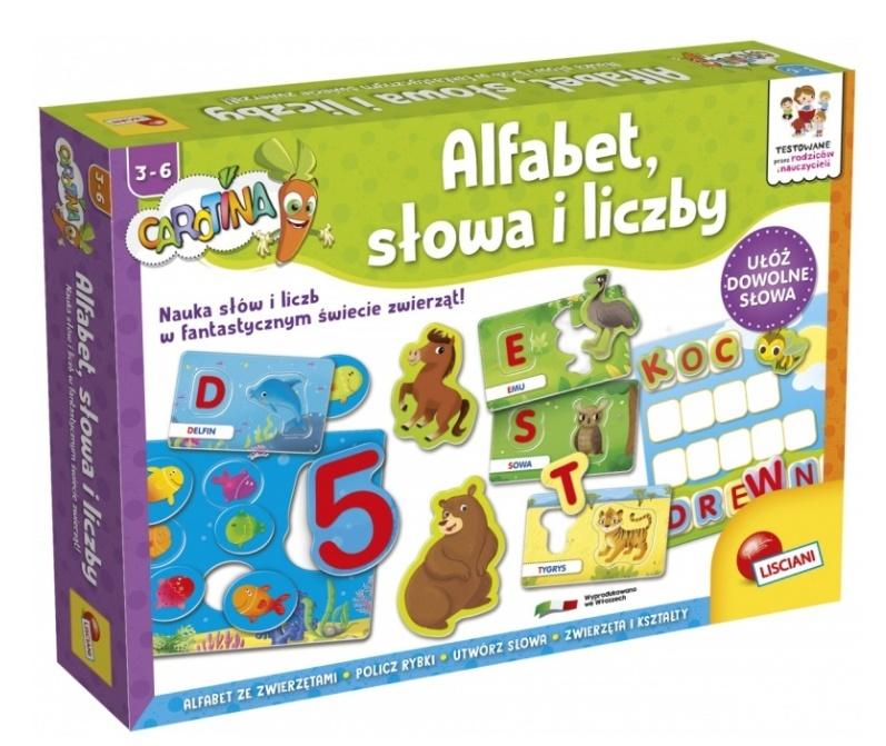 Skład produktu: 26 kart z alfabetem, literami i zwierzętami; 9 akwariów z rybkami i liczbami; Tablica ze słowami; Koperta; Zasady gry.