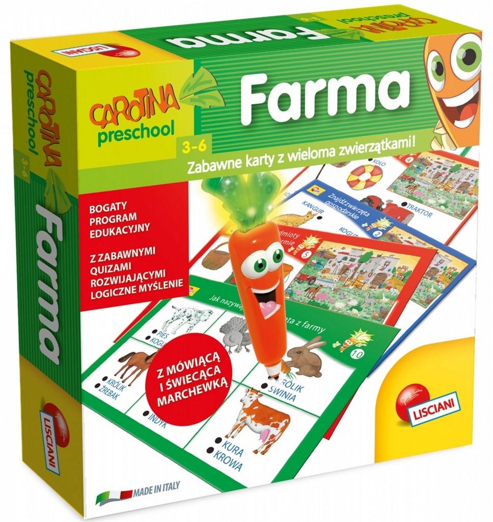 Z sympatyczną Carotiną dzieci uczą się poprzez zabawę! Gra opracowana, by pomóc najmłodszym dzieciom w nauce podstawowych zagadnień, w sposób zabawny i spontaniczny. Program stopniowej nauki z kolorowymi kartami i magiczną Carotiną pozwalają więc na naukę pełną radości. Wystarczy odpowiedzieć na pytania, zbliżając czubek Marchewki do czarnego punktu, które odpowiada wybranej odpowiedzi. Jeśli odpowiedź jest prawidłowa, Carotina wydaje wesołe okrzyki. Dziecko może dzięki temu samo skorygować swoją odpowiedź.