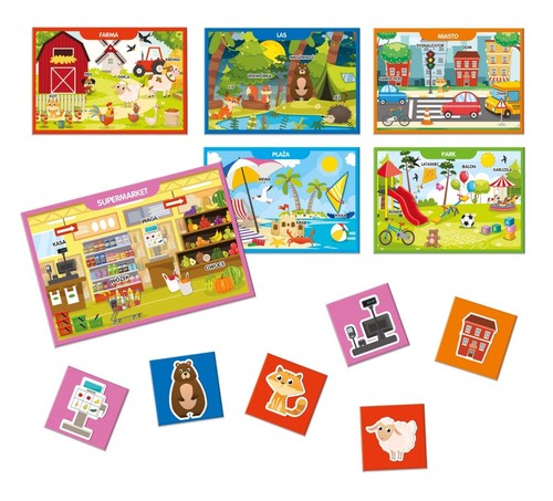 Zawartość: 6 tablic z obrazkowym słownikiem, 24 karty do loterii, instrukcja