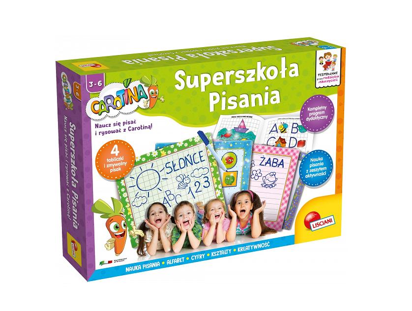 Carotina Superszkoła Pisania to wyjątkowy zestaw edukacyjny, który pomaga stopniowo rozwijać pisanie. W opakowaniu znajdują się 4 suchościeralne tablice oraz zeszyt z ćwiczeniami, które uszeregowane są według stopnia trudności. Początkowo dziecko uczy się kopiować wzory by później przejść do pisania pierwszych literek i wyrazów. Dodatkowo, aby wzmocnić efekt edukacyjny, każda literka czy słowo jest kojarzona wraz z obrazkiem. Dla dzieci w wieku od 3 do 6 lat
