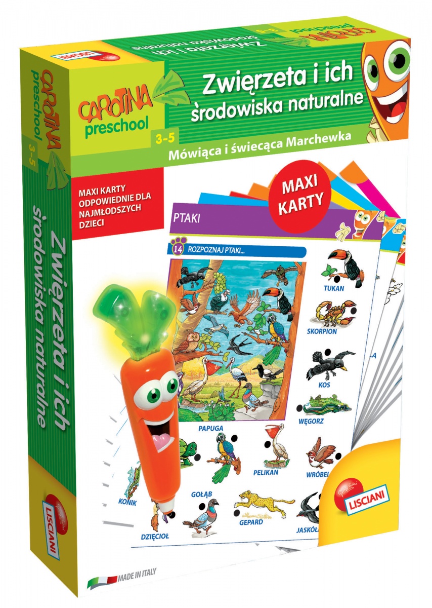 Karty Carotina są przeznaczone dla dzieci w wieku przedszkolnym. Są duże i zawierają przejrzyste ilustracje i teksty.Treść dydaktyczna została opracowana na podstawie programu nauczania w przedszkolach. Gdy dziecko udzieli dobrej odpowiedzi, Carotina nagrodzi je wesołymi okrzykami.