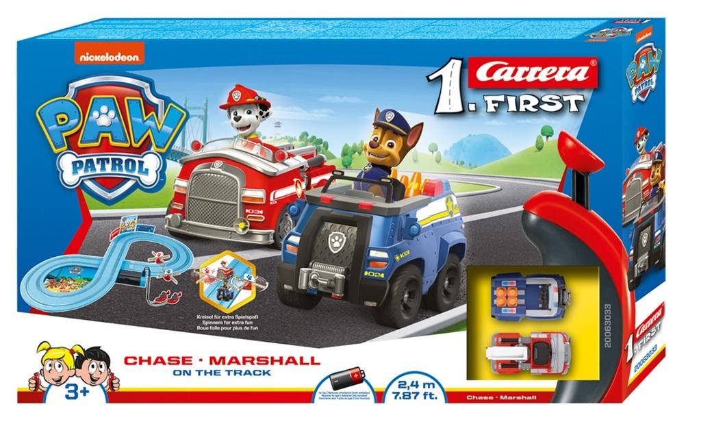 W tym Carrera FIRST PAW Patrol - On the Track Set, niezdarny dalmatyński Marshall ze swoim wozem strażackim i sportowy pasterz Chase ze swoim radiowozem rywalizują ze sobą. Dwa automaty w skali 1:50 zapewniają ekscytujący pojedynek na 2,4-metrowym torze wyścigowym i przejeżdżają obok typowej dekoracji toru PAW Patrol - po prostu naprawdę fajnie! Na torze każdy gokart z psem musi przejechać rondo raz na okrążenie. Zapewnia to dodatkowy czynnik zabawy. Dzięki licencji PAW Patrol zestaw Carrera FIRST otrzymuje świetny design, który zanurza każdego małego kierowcę w świecie dzielnych drużyn psów. W zestawie znajdują się dwa przyjazne dzieciom kontrolery ręczne. Akumulatory typu C są wymagane do sterowania samochodami.