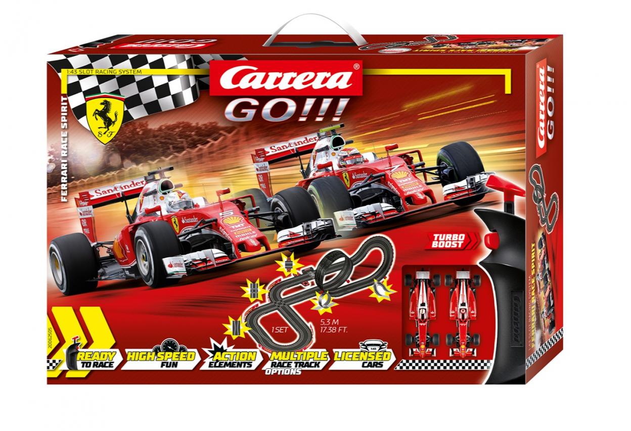 W zestawie znajduje się: - Ferrari SF16-H ""S.Vettel, No.5"" 64086 - Ferrari SF16-H ""K.Rikknen, No.7"" 64121 -1 Szyna przyłączeniowa -1 Transformator -2 Kontrolery - zwężenie oraz skrzyżowanie - pochyły zakręt - pętla - licznik okrążeń - zapasowe wymienne szczotki stykowe i prowadnice - instrukcja PL Rozmiary po rozłożeniu: 160 x 95 cm Długość toru: 5,3 m Carrera GO!!! to system startowy do Świata Wyścigów Carrera, stworzony w skali 1:43. Wszystkie zestawy z tej serii zawierają kontroler turbo doładowania, a także oryginalne, licencjonowane samochody, wykonane z ogromną dbałością o szczegóły. Do każdego z nich dołączony jest zawsze dodatkowy zestaw szczotek stykowych. Systemy torów są niezwykle łatwe w montażu i demontażu, dzięki unikalnemu systemowi zatrzasków.