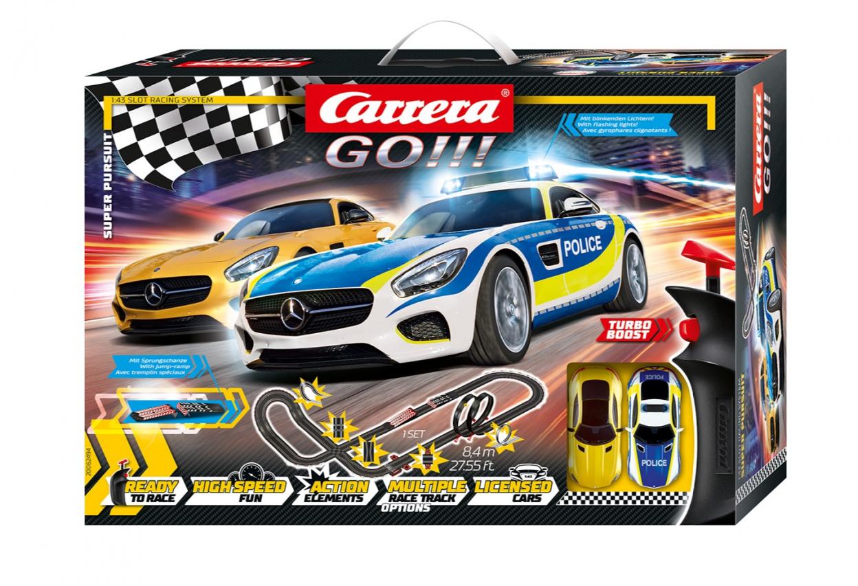 W zestawie znajduje się: - Mercedes AMG GT Coup ""Police"" 64117 - Mercedes-AMG GT Coup solarbeam 64119 - 1 Szyna przyłączeniowa - 1 Transformator - 2 Kontrolery - zwężenie oraz skrzyżowanie - pochyły zakręt - pętla - wyskocznia - licznik okrażeń -zapasowe wymienne szczotki stykowe i prowadnice - instrukcja PL Rozmiary po rozłożeniu: 262 x 154 cm Długość toru: 8,4 m Carrera GO!!! to system startowy do Świata Wyścigów Carrera, stworzony w skali 1:43. Wszystkie zestawy z tej serii zawierają kontroler turbo doładowania, a także oryginalne, licencjonowane samochody, wykonane z ogromną dbałością o szczegóły. Do każdego z nich dołączony jest zawsze dodatkowy zestaw szczotek stykowych. Systemy torów są niezwykle łatwe w montażu i demontażu, dzięki unikalnemu systemowi zatrzasków.