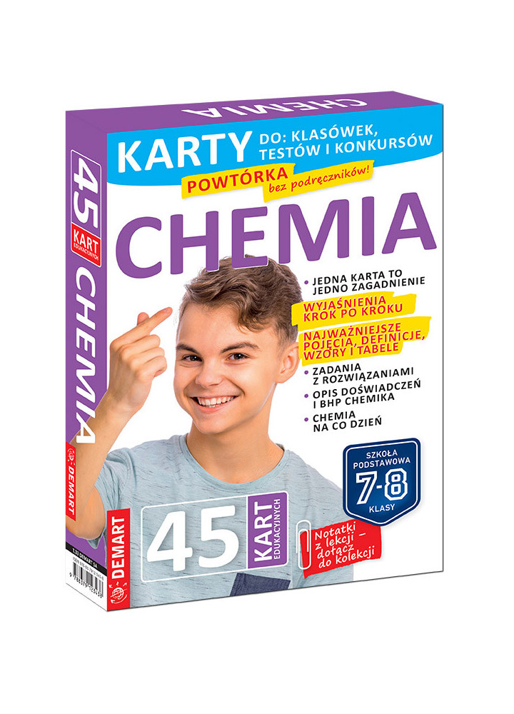 Karty edukacyjne z chemii zawierają wszystkie tematy omawiane w klasach VII-VIII w szkole podstawowej uwzględnione w podstawie programowej. 45 dwustronnych, kolorowych, starannie graficznie opracowanych kart zastępuje podręczniki z dwóch klas. Jedna karta prezentuje jeden temat. Format kart jest nieprzypadkowy mają się zmieścić w zeszycie i być ściągawką wyjaśniającą i podsumowującą prezentowane zagadnienie krok po kroku. Wiele zagadnień wyjaśniają poglądowe wzory strukturalne, schematy, rysunki i zdjęcia. Są też opisy doświadczeń i przykłady z życia codziennego.