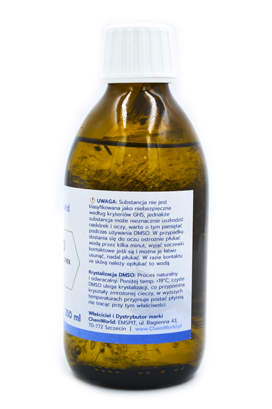No właśnie !!! DMSO, tak mnie w skrócie nazywają bo mam długą nazwę dimetylosulfotlenek no i trudną do wymówienia i chyba nie za bardzo mi się też podoba ta nazwa, tylko nikomu o tym nie mówcie, niech to zostanie między nami. Mimo wszystko jest o mnie głośno, moja popularność jest nadzwyczajna i nie przypadkowa. Jestem z tego dumny tym bardziej że należę do rodziny ChemWorld. Nie mogę napisać wszystkiego o sobie, a szkoda, ale jest o mnie wiele artykułów w internecie i są książki i wiele ludzi na świecie o mnie opowiada swoim znajomym. Proszę Wy też rozpowiadajcie o mnie wszystkim, bo zasługuję na to, jestem tak czysty, mocny i przydatny dla ludzi i zwierząt na całym świecie że warto o mnie mówić. Aha jeszcze coś, jestem pozyskiwany z miazgi drzewnej, natura mi jest bliska. Zanim zaczniesz mnie używać zapoznaj się z moimi zdolnościami, polecam a nawet proszę Was najpierw poczytajcie o mnie, a później Kupujcie nie zawiodę Was, taki właśnie jestem.