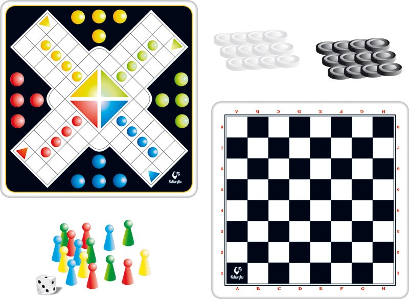 Do gry używa się: planszy, kostki i 16 pionków w czterech różnych kolorach.