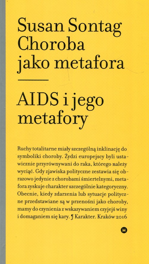 Dwa słynne eseje, które weszły do kanonu humanistyki. Analizując źródła naukowe i utwory literackie od antyku po czasy współczesne (odwołując się choćby do Homera, Baudelaire'a, Manna, Joyce'a czy Audena) Susan Sontag rekonstruuje mitologię gruźlicy i choroby nowotworowej. Pokazuje przy tym sposoby, w jakie społeczeństwo stygmatyzuje chorych i demistyfikuje ideologiczne fantazmaty, które zmierzają do demonizacji niektórych chorób. Drugi esej, napisany pod koniec lat 80., jest pionierską analizą AIDS i społecznych wyobrażeń, jakie towarzyszyły pojawieniu się tej choroby. Współczesne ruchy totalitarne, zarówno prawicowe, jak i lewicowe, miały szczególną - i bardzo charakterystyczną - inklinację do symboliki choroby. Naziści głosili, że osoba „nieczysta rasowo” przypomina syfilityka. Żydzi europejscy byli ustawicznie przyrównywani do syfilisu i raka, którego należy wyciąć. Metafory choroby były na porządku dziennym w retoryce bolszewików i Trocki, najbardziej utalentowany polemista komunistyczny, używał ich w wielkiej obfitości – zwłaszcza po wygnaniu ze Związku Radzieckiego w 1929 roku. Stalinizm przyrównywał do cholery, syfilisu i raka. Kiedy zjawiska polityczne przyrównuje się obrazowo jedynie do chorób śmiertelnych, metafora zyskuje charakter szczególnie kategoryczny. Obecnie, kiedy zdarzenia lub sytuacje polityczne przedstawiane są w przenośni jako choroby, mamy do czynienia z wskazywaniem czyjejś winy i domaganiem się kary. [fragment książki]