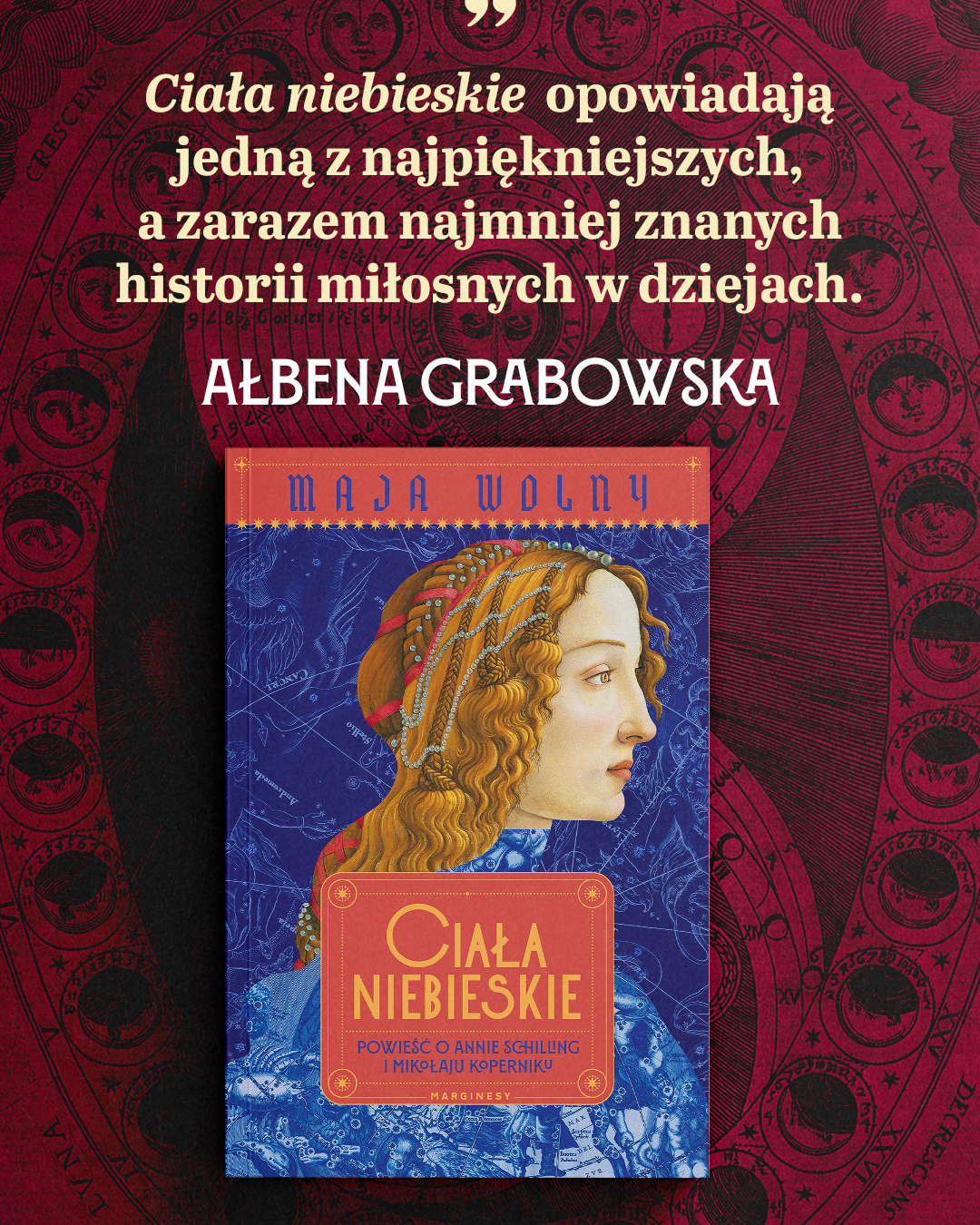 Ciała niebieskie opowiadają jedną z najpiękniejszych, a zarazem najmniej znanych historii miłosnych w dziejach. Maja Wolny z niezwykłą wrażliwością i dbałością o szczegół ukazuje barwną, autentyczną epokę, ale to miłość - krucha, odważna, bezkompromisowa - staje się tu prawdziwym centrum wszechświata. Poznajemy wielkiego astronoma, jakiego nie znamy: targanego pragnieniem, rozdartego między obowiązkiem a uczuciem, które nie powinno było się wydarzyć a jednak się wydarzyło - i to z taką mocą, że nie sposób mu zaprzeczyć.