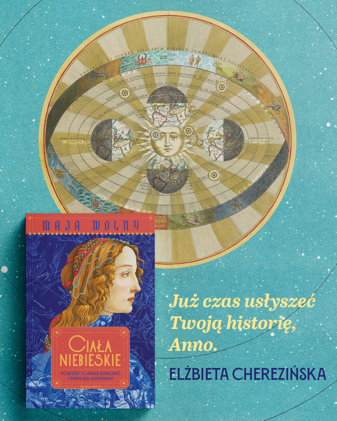 Świat zatrząsł się w posadach. Luter pół Europy obudził, pół przeraził śmiertelnie. A czasy niepokoju budzą demony - luteranin, heretyk, czarownica, zło może czaić się wszędzie. Anna Schilling doświadcza go w głębi własnego domu. Milczy jednak, jak każe spowiednik, wszak jej mąż to szanowany kupiec, a w Gdańsku rządzi pieniądz. Niklas Koppernigk pracuje zaś bez ustanku. Administruje kapitułą, leczy ludzi, pisze traktaty ekonomiczne, na zlecenie papieża reformuje kalendarz. A nocami patrzy w niebo, oblicza trajektorie planet. Los sprawia, że ścieżki tych dwojga się spotykają. Niemłodzi, a głodni miłości. Duchowny i mężatka. Świat dał im niewiele wspólnych lat, ale to w cieniu ich miłości wyrastało dzieło O obrotach sfer niebieskich. Już czas usłyszeć twoją historię, Anno.
