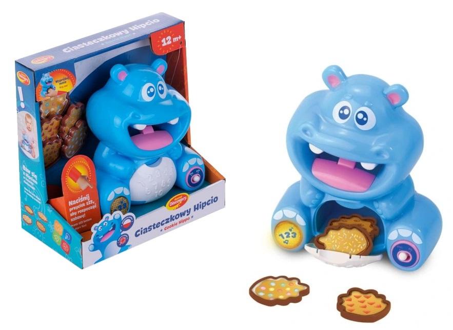 Dwujęzyczny Hipcio (polski/angielski) liczy kolorowe ciasteczka, łakomie się nimi zajadając. Kiedy Dziecko naciśnie na stópkę rozpocznie zabawę w liczenie oraz usłyszy zabawne dźwięki i melodie. Nakarm Hipcia i policz ile jest w stanie zjeść ciasteczek. Po wyjęciu ciasteczek z brzuszka rozpoczynamy zabawę od nowa.