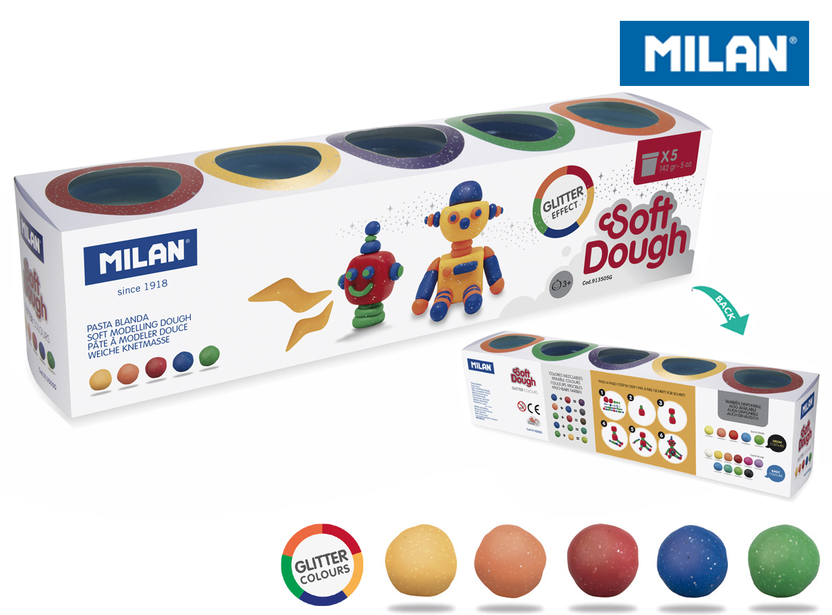 Miękka masa plastyczna. Spójna i eleastyczna, łatwa do formowania. Nowe kolory można tworzyć łącząc dwa lub więcej kolorów. Nie pozostawia resztek na rękach. Opakowanie zawiera 5 kubeczków o pojemności 142 g z przezroczystymi pokrywkami w 5 kolorach, które dają efekt brokatu: żółty, pomarańczowy, czerwony, niebieski i zielony. Składniki pochodzenia roślinnego. Rozmiar opakowania: 35,3 x 8,5 x 7,4 cm.