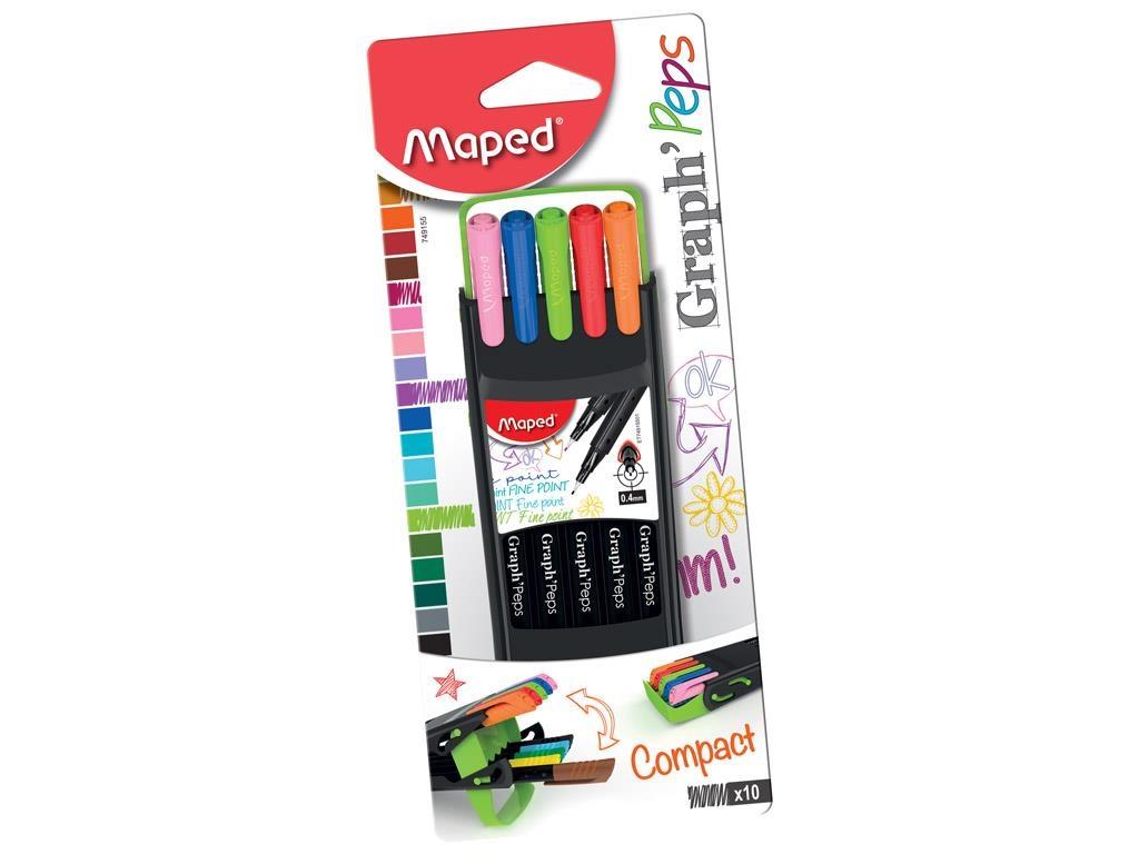 Cienkopis Graph’Peps. Uniwersalna linia cienkopisów dla każdego, do użycia w szkole, w domu i w biurze. Końcówka oprawiona w metal. Grubość końcówki 0,4mm. Bezpieczna, wentylowana skuwka z klipsem. Ergonomiczny, trójkątny kształt poprawia komfort pisania. Praktyczne, trwałe etui - umożliwia łatwy wybór koloru i sprawdza sie jako piórnik. Opakowanie zawiera 10 sztuk cienkopisów w różnych kolorach. JS 1 etui.