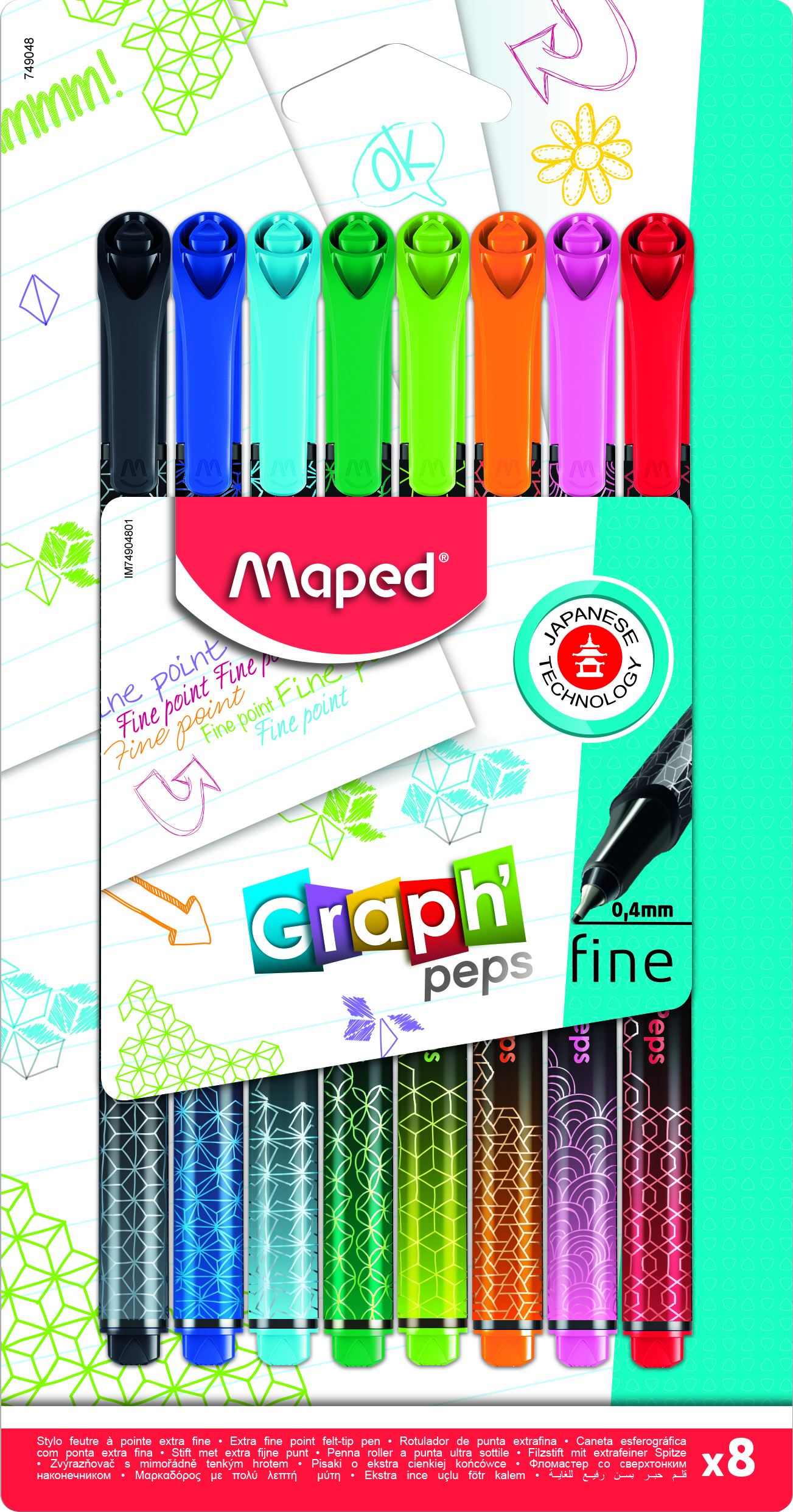 Cienkopis Graph'Peps Deco. Uniwersalna linia cienkopisów dla każdego, do użycia w szkole, w domu i w biurze. Końcówka oprawiona w metal. Grubość końcówki 0,4mm. Bezpieczna, wentylowana skuwka z klipsem. Ergonomiczny, trójkątny kształt poprawia komfort pisania. Korpus zdobiony błyszczącymi wzorami w kolorze tuszu. Blister 8 szt.