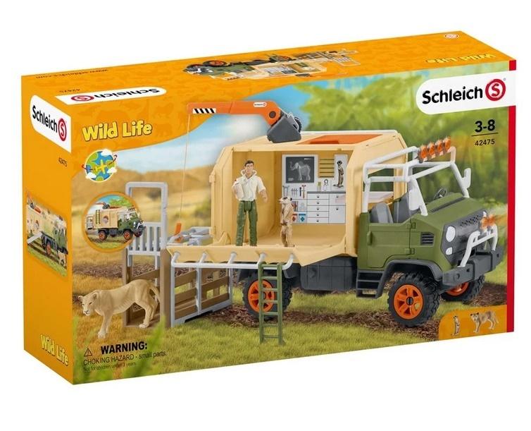 Strażnik Tom i jego przyjaciel surykatka Ted wyruszają ciężarówką ratunkową dla zwierząt z serii Schleich(R) Wild Life do pierwszej wspólnej akcji ratunkowej. Podczas safari Tom i Ted znajdują lwicę, której muszą udzielić natychmiastowej pomocy w ciężarówce. W tym celu spuszczają kabinę ratunkową na ziemię. Teraz mogą pomóc lwicy. Ich auto jest bowiem świetnie wyposażone, a strażnik Tom zawsze ma przy sobie apteczkę i stetoskop. Po opatrzeniu lwica umieszczona zostaje w skrzyni transportowej. Najpierw za pomocą dźwigu kabina wciągana jest na ciężarówkę, a potem skrzynia może zostać umocowana na samochodzie. Przy dużym wodopoju Tom i Ted wypuszczają lwicę ze skrzyni. Tu będzie mogła sobie odpocząć. Wciągarkę do dźwigu można przymocować przy kabinie kierowcy.