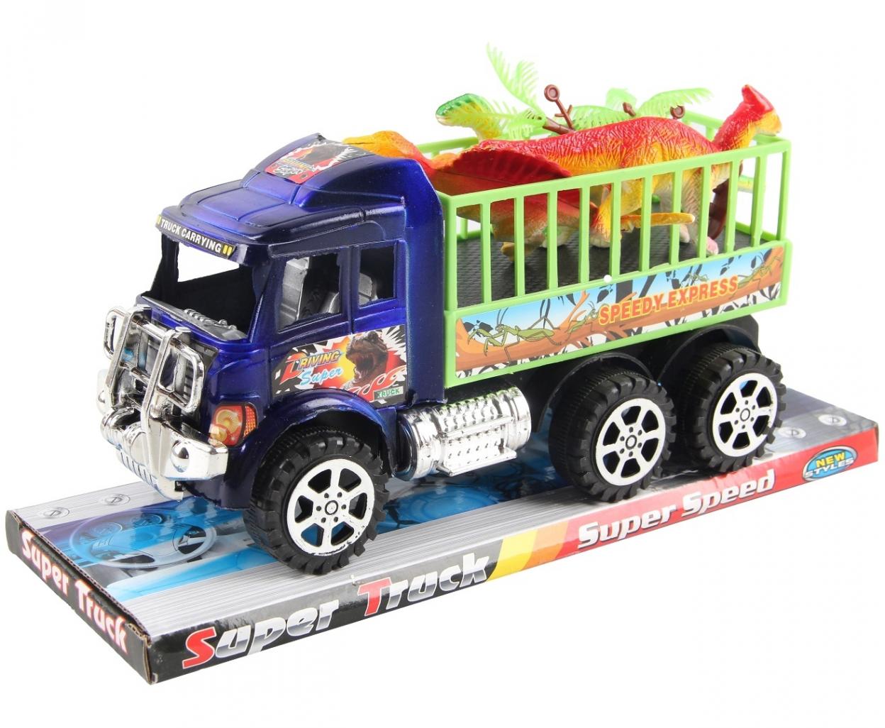 Ciężarówka Transportowa z Dinozaurami "Super Truck" - Przewieź Prehistoryczne Stwory! Przedstawiamy imponującą ciężarówkę transportową "Super Truck" z lawetą, przeznaczoną do przewozu dinozaurów! To idealna zabawka dla małych miłośników pojazdów i prehistorycznych gadów, która zapewni wiele godzin ekscytującej zabawy w świecie wyobraźni. Główne cechy produktu: Duża ciężarówka: Solidna, niebieska ciężarówka z napisem "TRUCK CARRYING", wyposażona w chromowane detale na zderzaku i grillu, co nadaje jej realistyczny wygląd. Posiada masywne koła z chromowanymi felgami, zapewniające stabilność i wytrzymałość. Laweta do przewozu dinozaurów: Do ciężarówki dołączona jest zielona laweta z wysokimi, klatkowymi ścianami, idealna do transportowania zwierząt z dżungli lub dinozaurów. Na boku lawety widnieje napis "SPEEDY EXPRESS" i grafika z dinozaurami. Figurki dinozaurów: W zestawie znajdują się figurki dinozaurów o różnych kształtach i kolorach - jeden to czerwony pterodaktyl, a drugi to zielony, długoszyi dinozaur. Idealne do odgrywania scen z safari lub epoki prehistorycznej. Realistyczne detale: Zarówno ciężarówka, jak i laweta posiadają szczegółowe elementy, które zwiększają atrakcyjność zabawy, takie jak wzory na kabinie ciężarówki imitujące styl "Driving Power". Rozwija wyobraźnię i kreatywność: Zestaw zachęca dzieci do tworzenia własnych historii o transportowaniu dinozaurów do zoo, ich ratowaniu z niebezpieczeństwa czy badaniu prehistorycznego świata. Solidne wykonanie: Zabawka wykonana jest z trwałego tworzywa sztucznego, co zapewnia długie godziny zabawy. Estetyczne opakowanie: Całość jest zapakowana na kartonowej podstawie z nadrukiem "Super Truck" i "Super Speed" oraz grafiką sugerującą dynamikę i przygodę. Widoczne jest również oznaczenie "NEW TOYS". Zalecany wiek: Brak wyraźnego oznaczenia wieku na opakowaniu, ale zabawki tego typu są zazwyczaj przeznaczone dla dzieci od 3 roku życia. Wielkość opakowania: 21x11x8 cm Podaruj swojemu dziecku tę imponującą ciężarówkę i pozwól mu na ekscytującą podróż do świata dinozaurów!