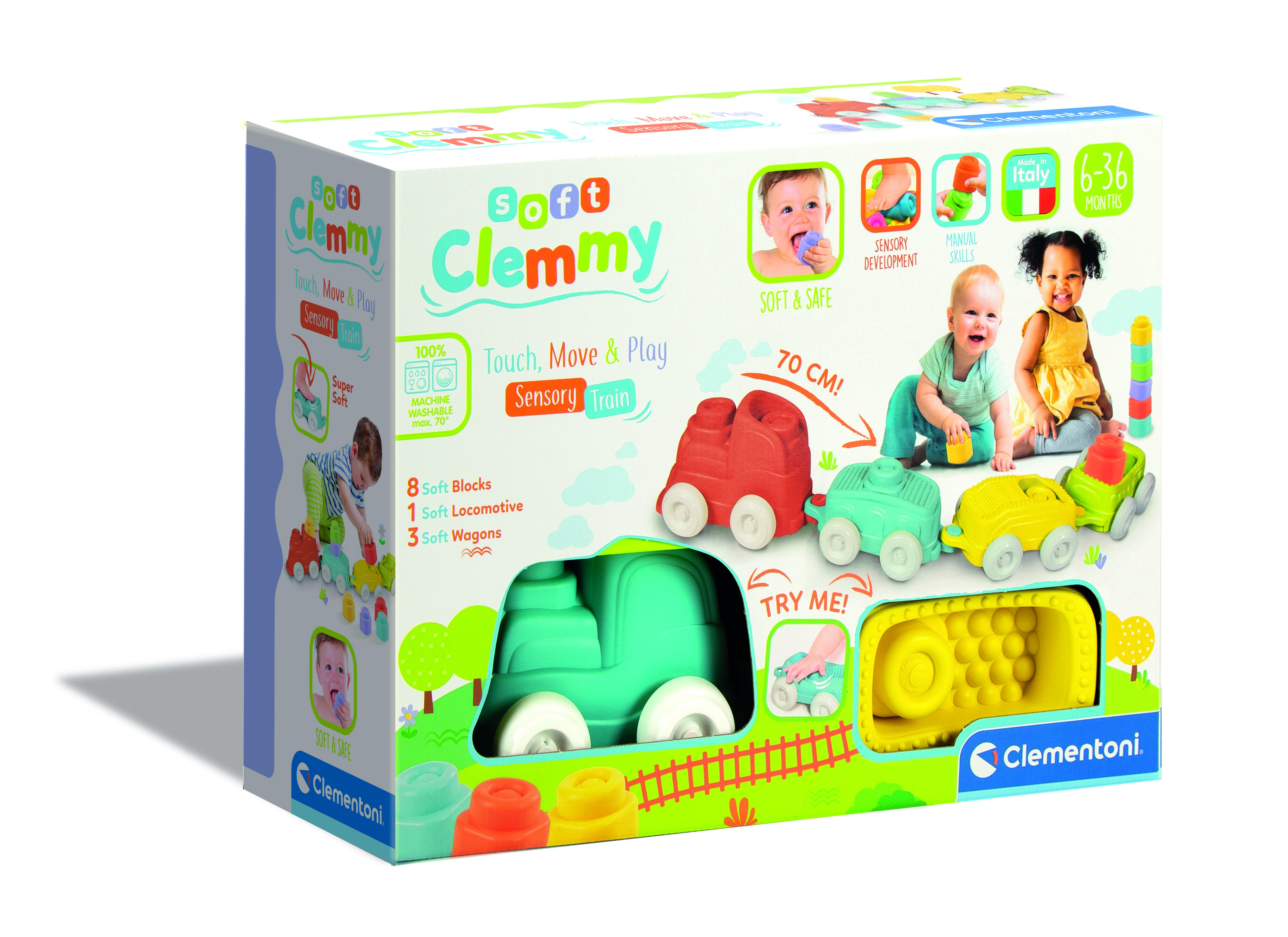 Miękka kolejka z lokomotywą i wagonami, przyjemna do zabawy i dotykania rękami.Dziecko będzie odkrywać wypukłości, kształty, miękkość materiału Clemmy, dokonując doświadczenia sensorycznego, które pomoże mu rozwijać zmysł dotyku oraz zręczność manualną.Miękkie kolorowe klocki, które można wkładać do wagoników i na lokomotywę lub ustawiać jeden na drugim, tworząc puszyste wieżyczki, aby potem je burzyć i na nowo ustawiać, i tak bez końca.Wagoniki można łatwo rozłączać i łączyć ze sobą.Kółka sprawiają, że pociąg jeździ, więc ciągnąc wagoniki możesz wymyślać wiele historii i podróżować w wyobraźni bez granic.Można prać w zmywarce do naczyń (maks. 70C).