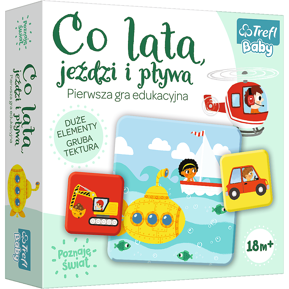 Co lata, jeździ i pływa to edukacyjna loteryjka, dzięki której maluch poznaje różne pojazdy i uczy się przyporządkowywać je do miejsc, w których możemy je spotkać. Przewodnik dla rodziców zawiera propozycje gier i zabaw.