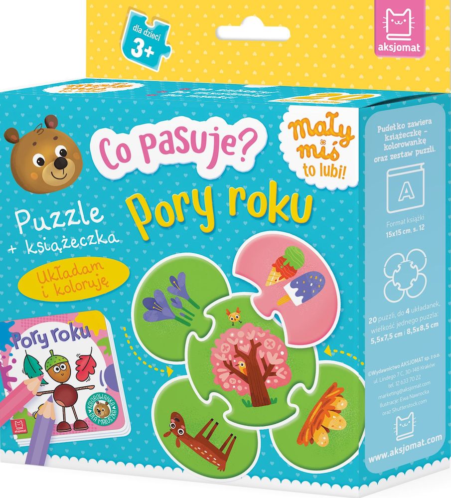 Puzzle służą do ułożenia 4 zestawów obrazków pasujących do danej pory roku. Zabawa polega na skojarzeniu pasujących do siebie rysunków i połączenia ich w całość. Dziecko nazywa pory roku oraz uczy się, jakie są ich charakterystyczne cechy. W książeczce znajdują się obrazki do pokolorowania - dziecko utrwala nazwy pór roku oraz ćwiczy rękę, kolorując. Dla dzieci powyżej 3. roku życia.