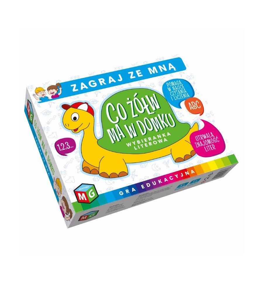 Co żółw ma w domku"" to gra dydaktyczna, która w przyjemny i intrygujący dla dziecka sposób wprowadza je w świat czytania, pisania i liczenia. Zabawa polega na rozszyfrowaniu słów umieszczonych na planszach, czyli tytułowych Żółwiach. Miłe dla oka, proste rysunki skupiają uwagę dzieci na rozpoznawaniu i identyfikowaniu liter oraz cyfr. Gra wzbogaca słownik dziecka i stymuluje komunikacje werbalną. Zawartość pudełka: 16szt. plansz ""Żółwie"", 48szt. tabliczek z literami, 16szt. tabliczek z obrazkami, instrukcja.